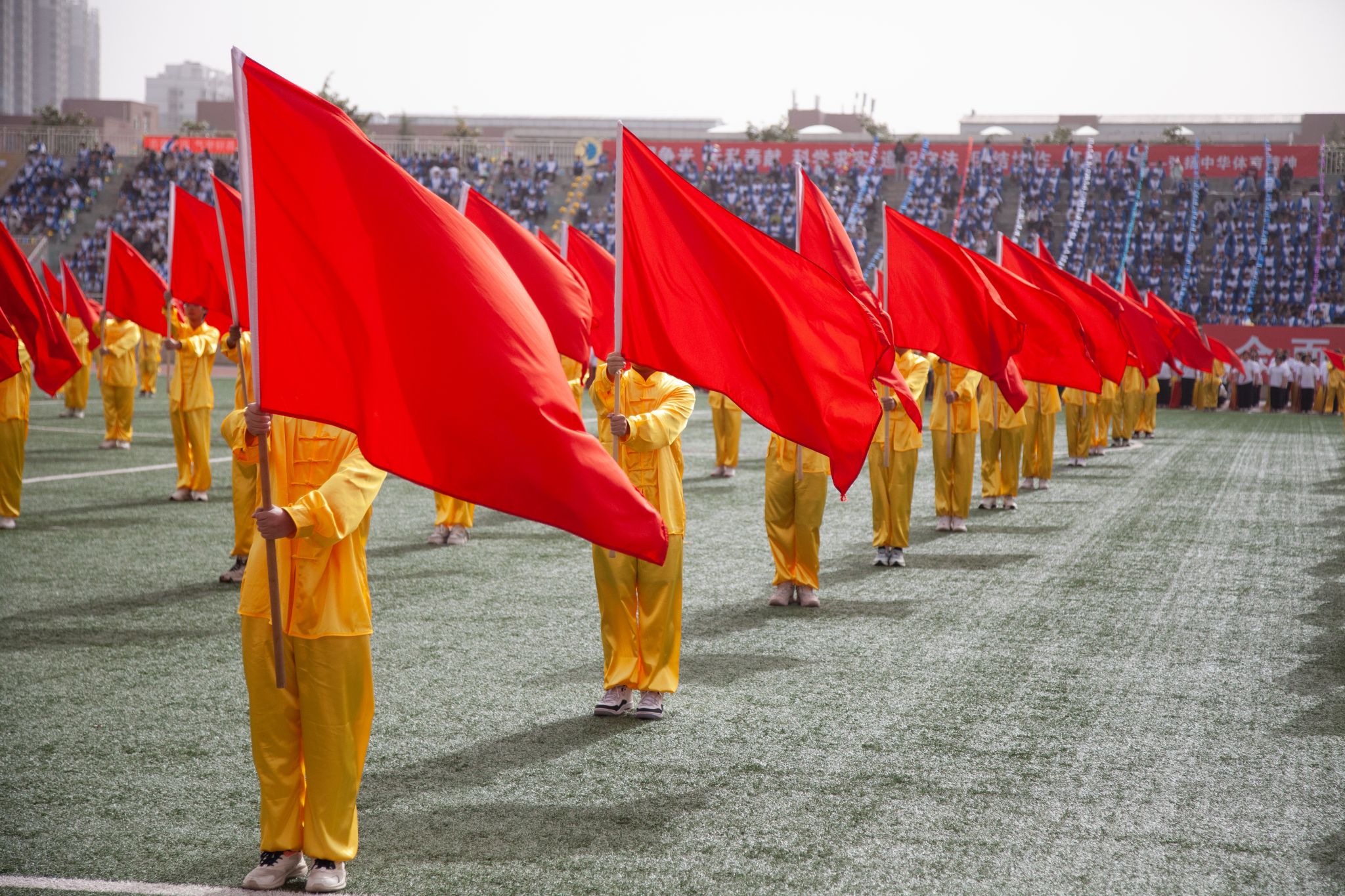 随后,在雄壮的国歌声和校歌声中,五星红旗、校旗和运动会会旗相继冉冉升起。