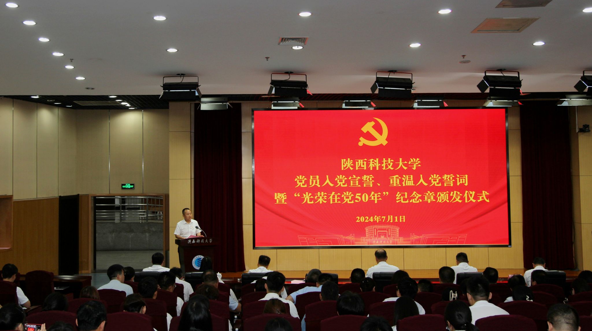 7月1日上午,在中国共产党成立103周年之际,为回顾中国共产党的光辉奋斗历程,增强广大党员的荣誉感、归属感、使命感,激励全校师生党员坚定理想信念、锤炼党性修养、弘扬优良作风,进一步推动党纪学习教育走深走实,凝聚起推动学校高质量发展的强大力量,学校在图书馆学术报告厅举行党员入党宣誓、重温入党誓词暨“光荣在党50年” 纪念章颁发仪式。校党委副书记李学军主持会议。
