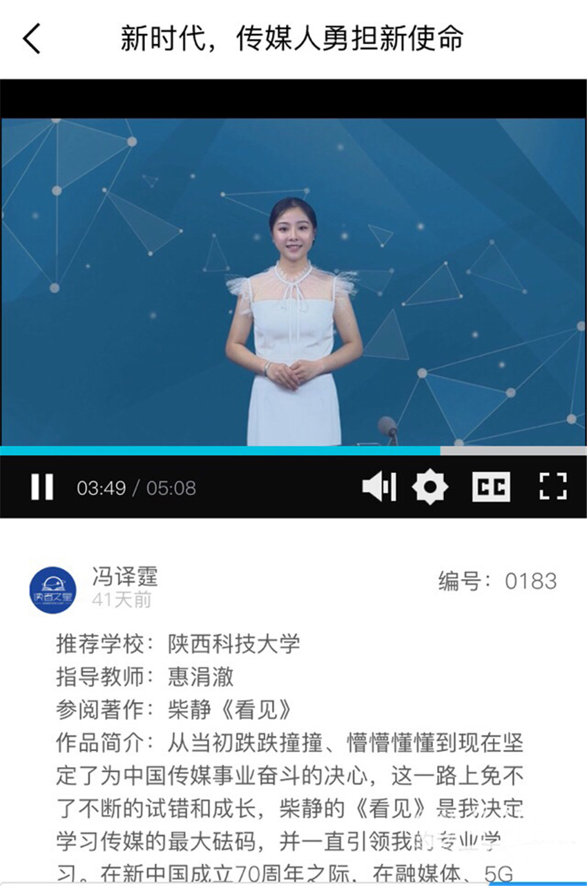 贝博官网设艺学院学生冯译霆,平时酷爱读书,专业功底深厚,知行合一,积极参加图书馆组织的读书活动和社会实践活动,曾经在《图书馆报》发表《读书会带给我前行的力量》一文。这次她结合自己专业,选择柴静《看见》作为参阅著作,原创演讲文稿。在图书馆惠涓澈老师的指导下一次又一次对演讲稿进行修改,并在老师推荐下观看了其他读书演讲比赛的优秀获奖视频,在着装、录制背景方面力求高雅和谐。经过精心准备,终于以读书写作功底及演讲风采的专业魅力斩获“悦读之星”称号。