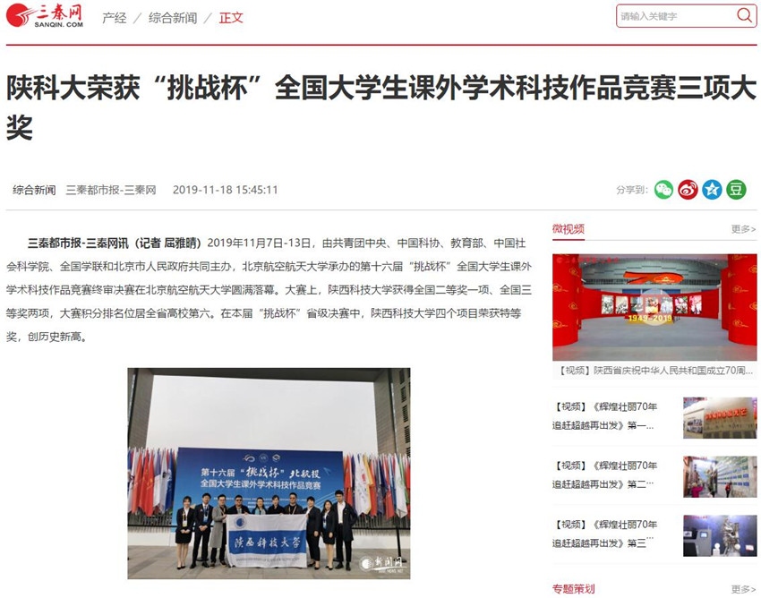 三秦网:陕科大荣获“挑战杯”全国大学生课外学术科技作品竞赛三项大奖