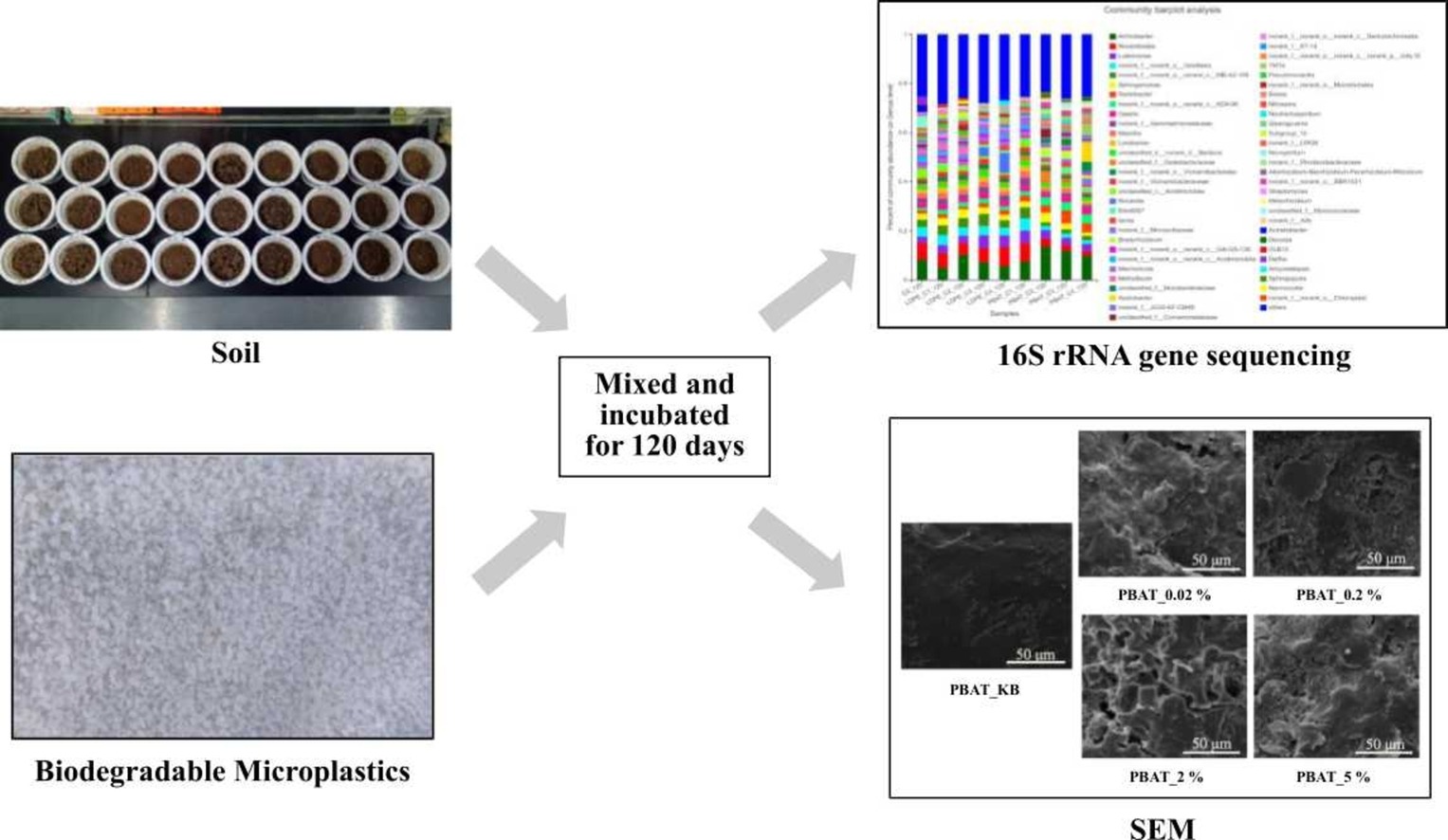 针对上述问题,李成涛课题组以低密度聚乙烯(LDPE,不可降解)为参照对象,以聚己二酸/对苯二甲酸丁二酯(PBAT,可生物降解)为试验对象,使用不同添加量的PBAT与LDPE颗粒进行土壤填埋降解实验,利用高通量测序技术对比分析PBAT微塑料的添加量和填埋时间对土壤理化性质、微塑料表面形态结构特征及微生物菌群结构、多样性的影响,综合分析PBAT在生物降解过程中的微塑料效应。