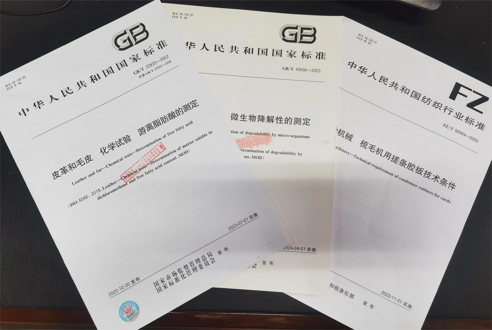 近日,贝博官网强涛涛教授承担的《皮革和毛皮化学试验游离脂肪酸的测定》(标准编号:GB/T22933-2022)、《皮革和毛皮微生物降解的测定(标准编号:GB/T43006-2023)》等两项国家标准和一项纺织行业标准《纺纱机械梳毛机用搓条胶胶板技术条件》(标准编号:FZ/T92064-2023)正式发布。