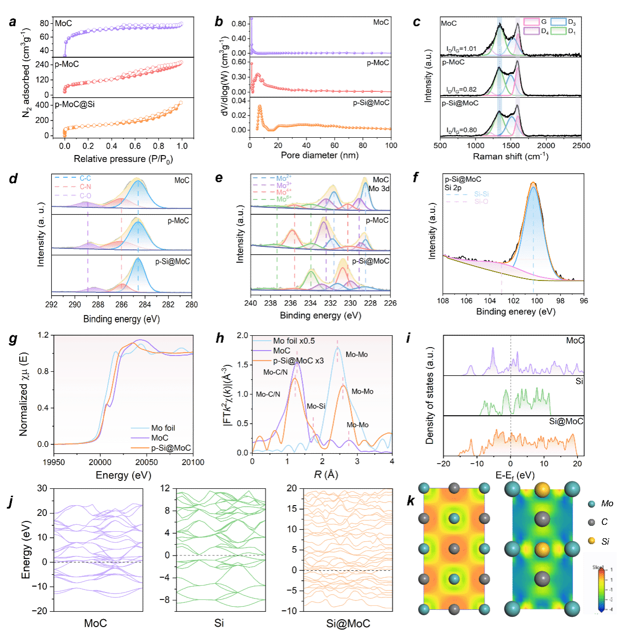 通过X射线近边吸收光谱(XANES)和扩展X射线吸收精细结构谱(EXAFS),验证了Si掺杂在MoC基体中形成的Mo-Si键。通过密度泛函理论(DFT)的计算,揭示了多孔Si@MoC优异的电导率和电子传递能力。