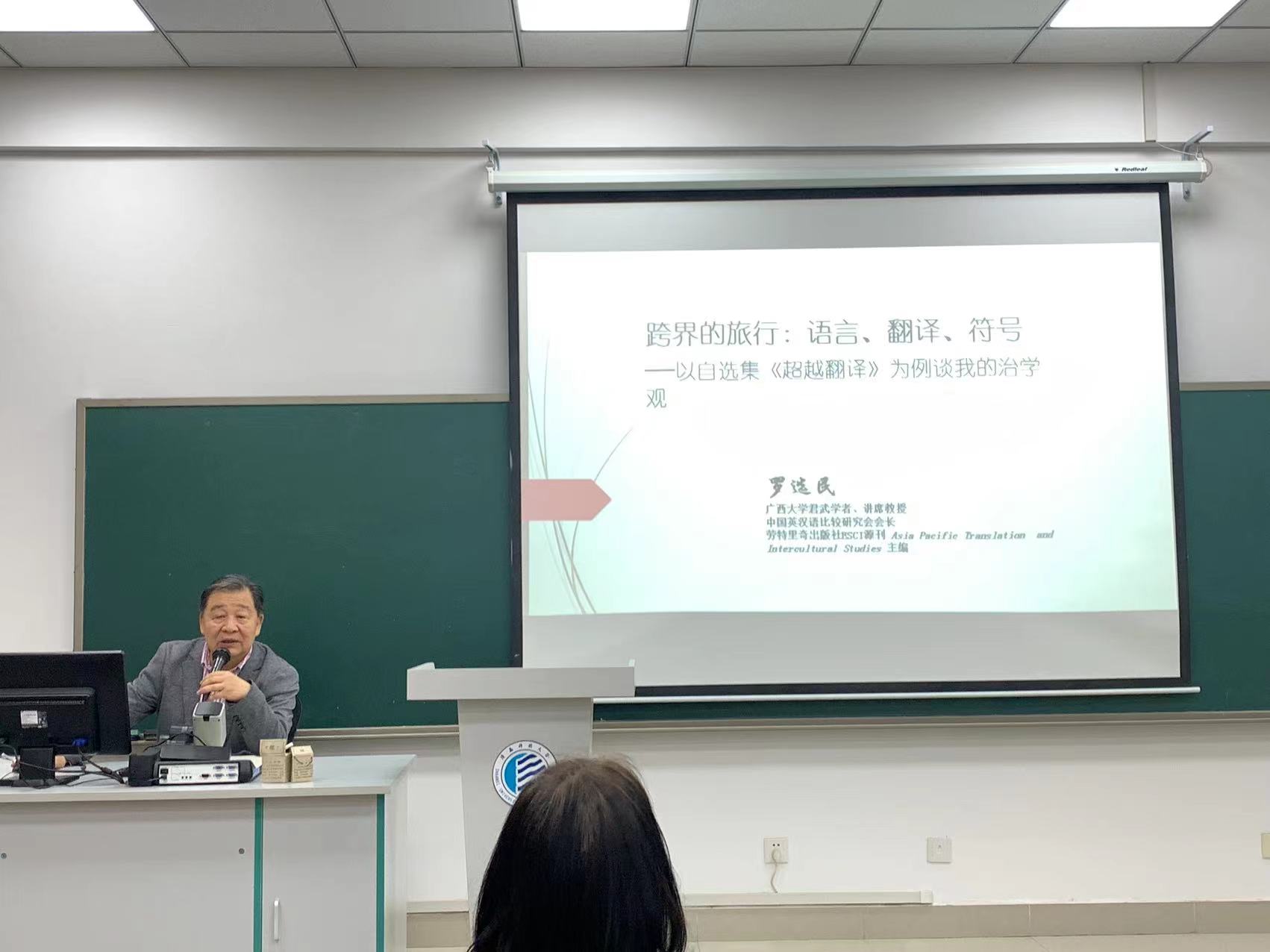 5月25日,广西大学武君学者、博士生导师罗选民教授应贝博官网文理学院邀请,为全体MTI学生和外语教师做了主题为“跨界的旅行:语言、翻译、符号——以自选集《超越翻译》为例谈谈我的治学观”的学术报告,拉开了贝博官网5月26-28日即将承办的语言服务研究国际学术会议的序幕,报告由文理学院外语学科特聘教授司显柱主持。
