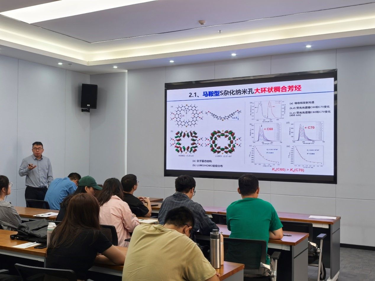 环状稠合芳烃作为一类新型的有机光电磁半导体材料,由于其独特的电子和空间几何结构特征而有望在有机光电子器件和超分子传感检测等领域获得突破性应用,其中主要的挑战是环状稠合芳烃的化学湿法精准合成困难,光电功能探索欠缺。在报告中陆雪峰教授详细介绍了构建几何结构可控的环状稠合芳烃新方法及其分子几何结构、超分子组装、聚集态结构、阴离子检测和载流子传输性能的构效关系。与会师生热情的与陆雪峰教授进行了交流探讨,本次学术交流活动圆满成功。