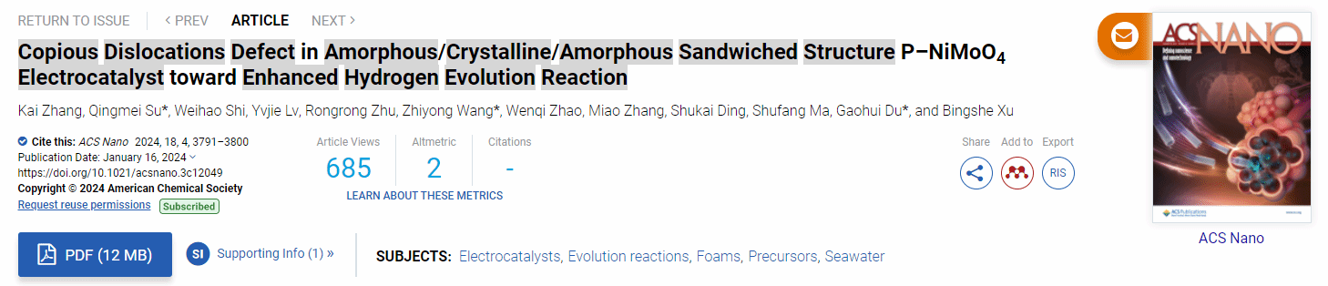 近日,贝博官网物理与信息科学学院许并社教授团队在电催化制氢领域取得重要进展,相关成果以“Copious dislocations defect in amorphous/crystalline/amorphous sandwiched structure P-NiMoO4 electrocatalyst towards enhanced hydrogen evolution reaction”为题,发表在国际顶级期刊ACS Nano(影响因子17.1)上。贝博官网博士研究生张凯为第一作者,苏庆梅教授、王智勇教授和杜高辉教授为共同通讯作者,BB贝博艾弗森官方网站为唯一通讯作者单位。