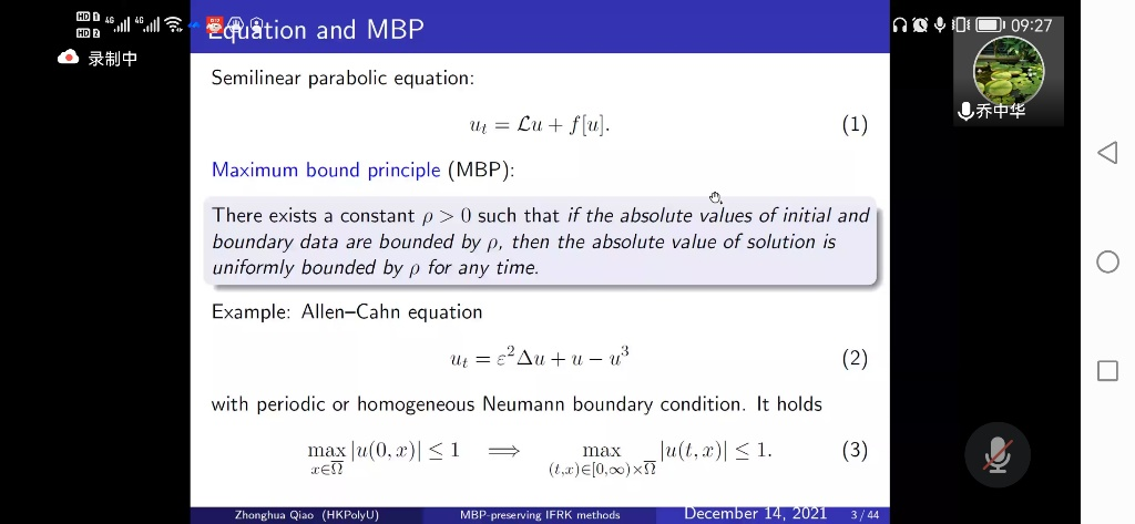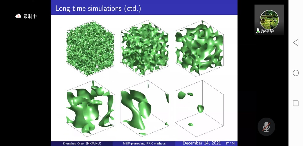 12月14日上午,应数学与数据科学学院邀请,香港理工大学乔中华教授做客贝博官网“前沿科学报告”,通过腾讯会议作了题为“Maximum bound principle preserving integrating factor Runge-Kutta methods for semilinear parabolic equations”的线上报告。报告会由数学学院副院长李剑教授主持,学院相关专业教师和研究生参加了报告会。